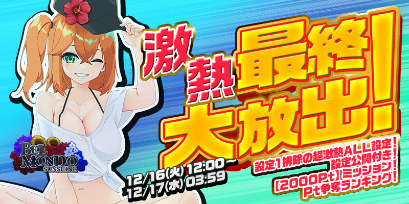 【設定公開付き】「ベルモンドSUNSHINE」最終大放出!<2000Pt>ミッション&Pt争奪ランキング開催!