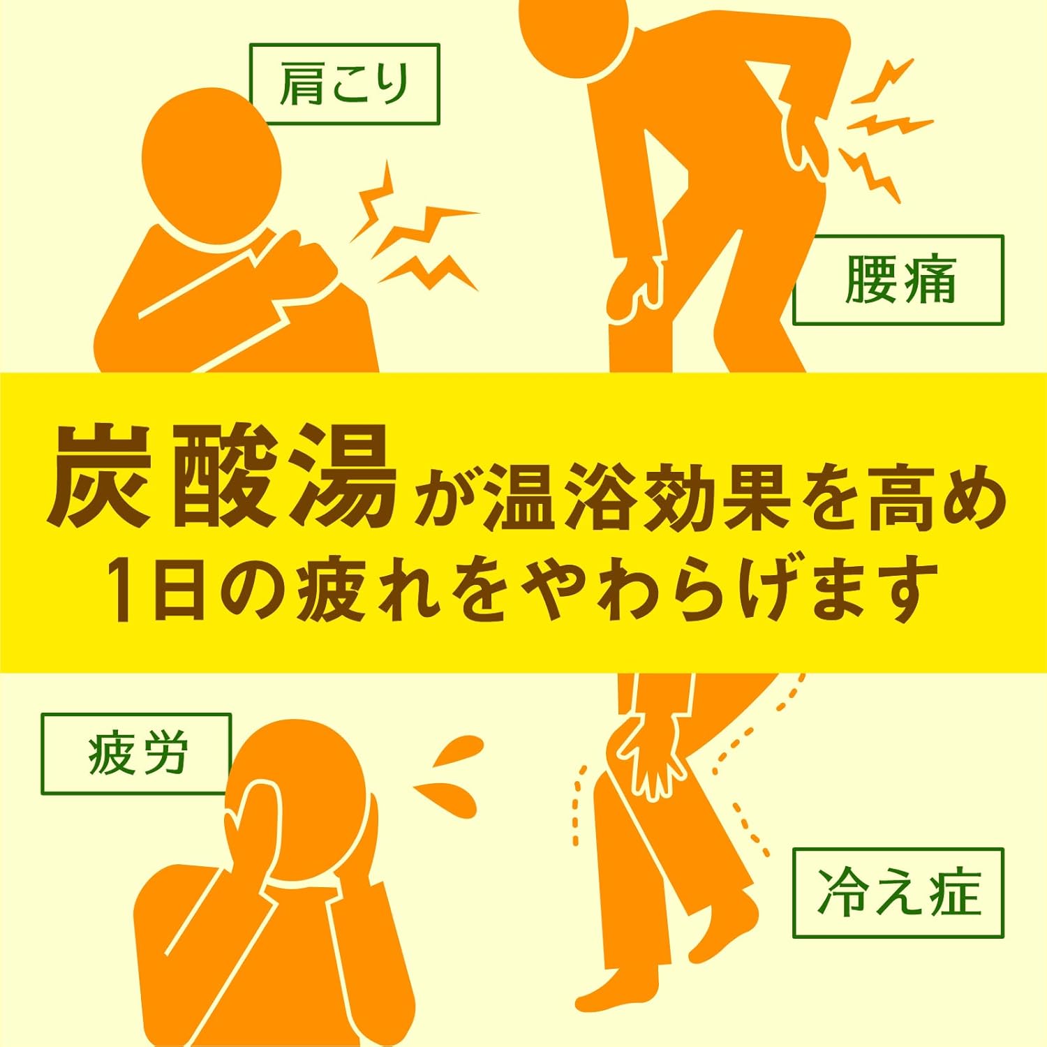 ●温泉成分(炭酸ナトリウム、硫酸ナトリウム)と炭酸ガスが温浴効果を高め、血行を促進し、肩こり・腰痛・冷え症に効果があり、1日の疲れをやわらげます。