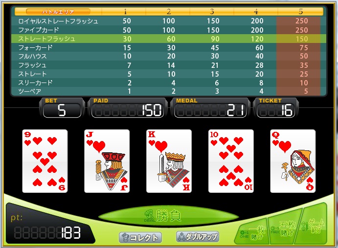 久々の連続勝利ブログ2~♪ 本日の嬉しかったこと~ ポーカーでストレートフラッシュ出来た♪ おかげで500ptでチケット25枚くらいになった♪ こういうのたまにあると嬉しいなぁ(´▽`*)