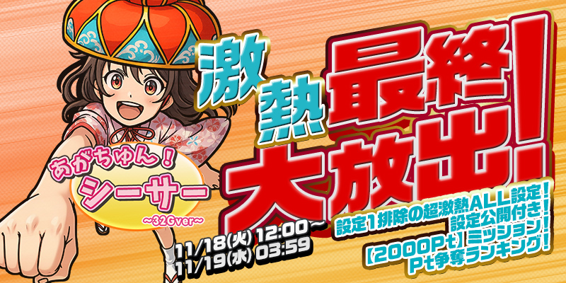 【設定公開付き】「わいわい!あがちゅん!シ~サ~ 32Gver」最終大放出!<2000Pt>ミッション&Pt争奪ランキング開催!