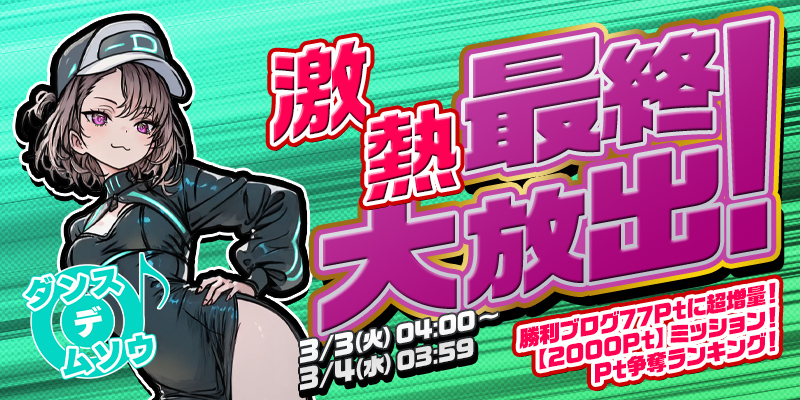 【勝利ブログ77Ptに超増量】「ダンス×デ×ムソウ」最終大放出!<2000Pt>ミッション&Pt争奪ランキング開催!