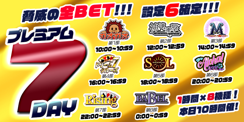 【プレミアム7Day】7の付く日はプレミアム7Day!17日は前代未聞のオールレート【設定6】確定!超絶本気の最高設定祭り!