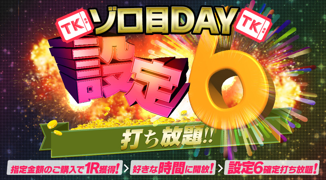 ゾロ目DAY!TKエリア人気10機種<2時間>【設定6】打ち放題♪