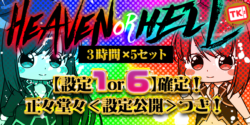 【設定1or6確定】全BET対象「HEAVEN.or.HELL」3時間×5セット<設定公開>つき!